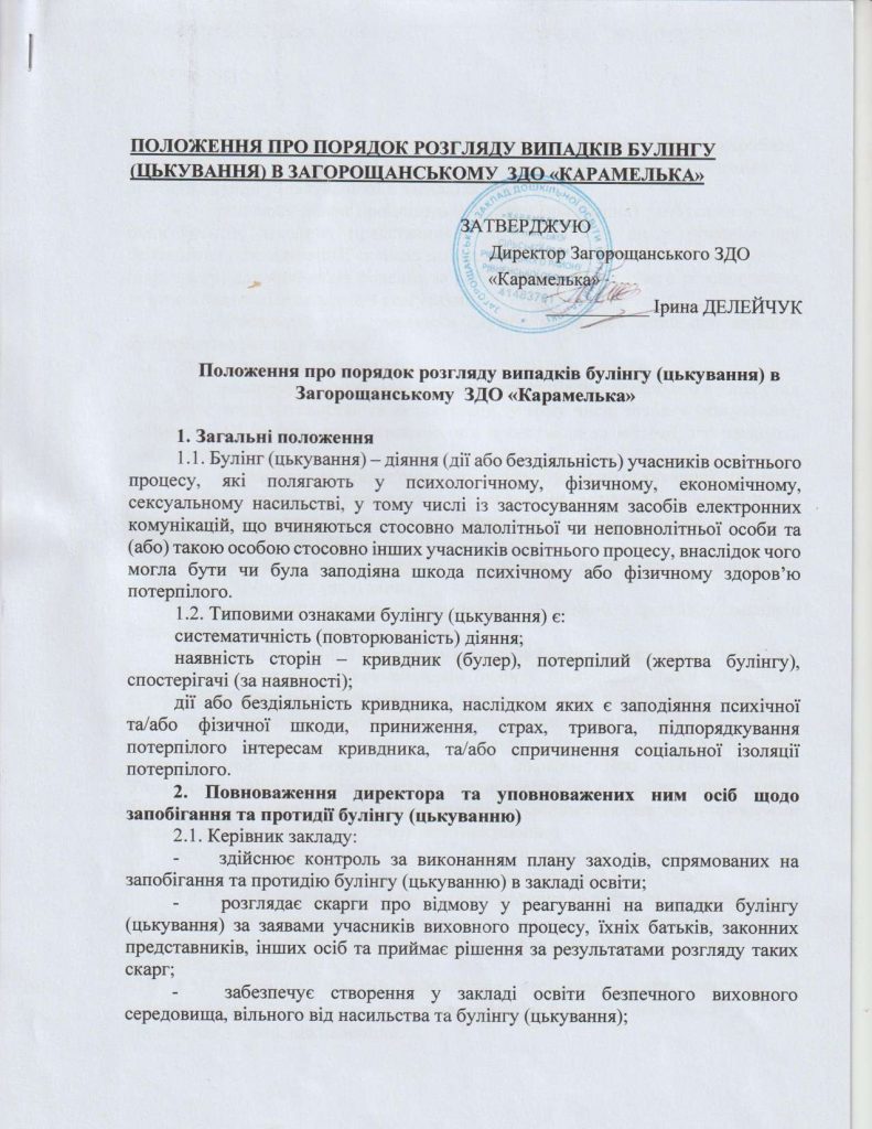 Положення про порядок розгляду випадків булінгу (цькування) в Загорощанському ЗДО “Карамелька”